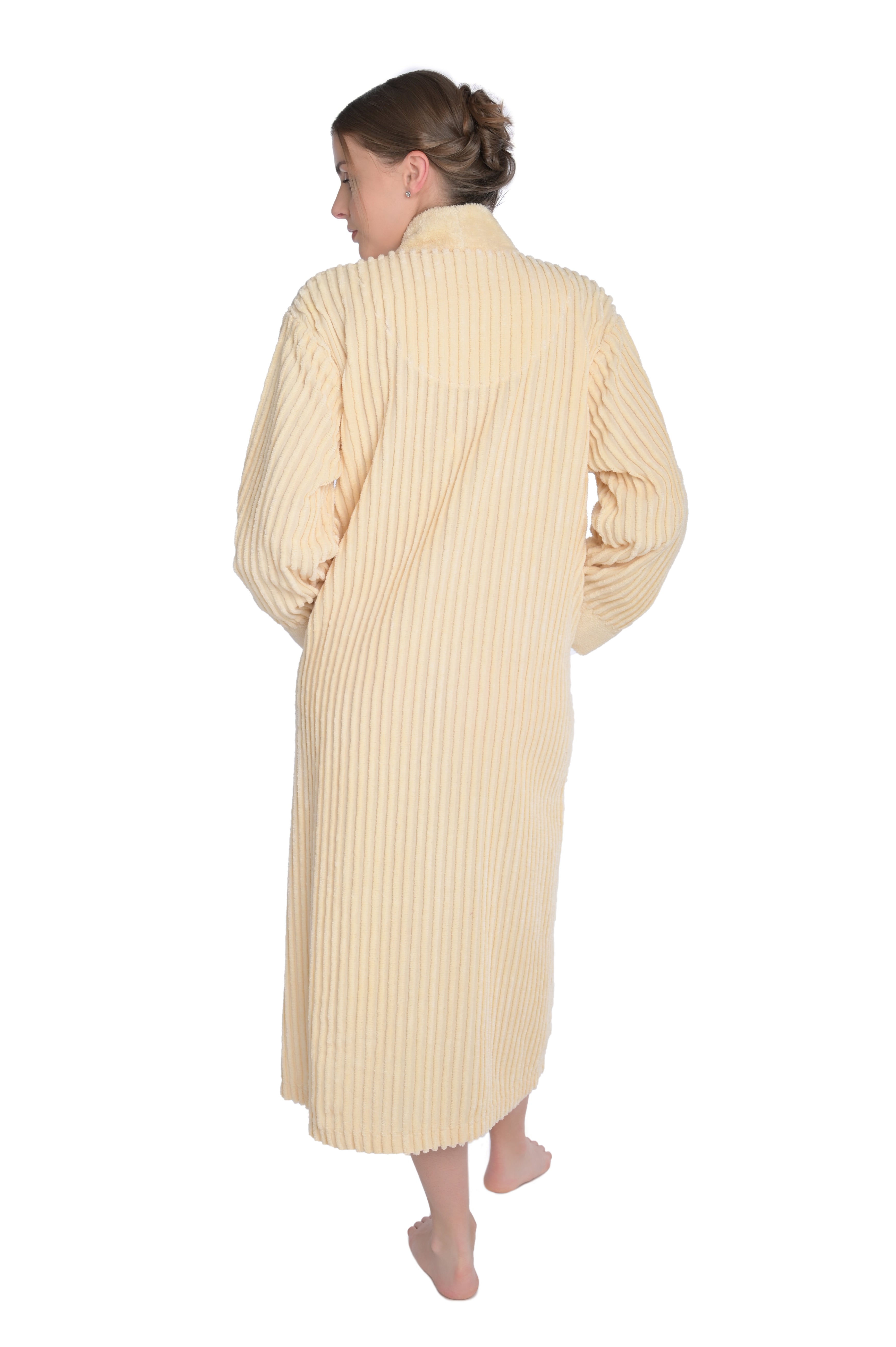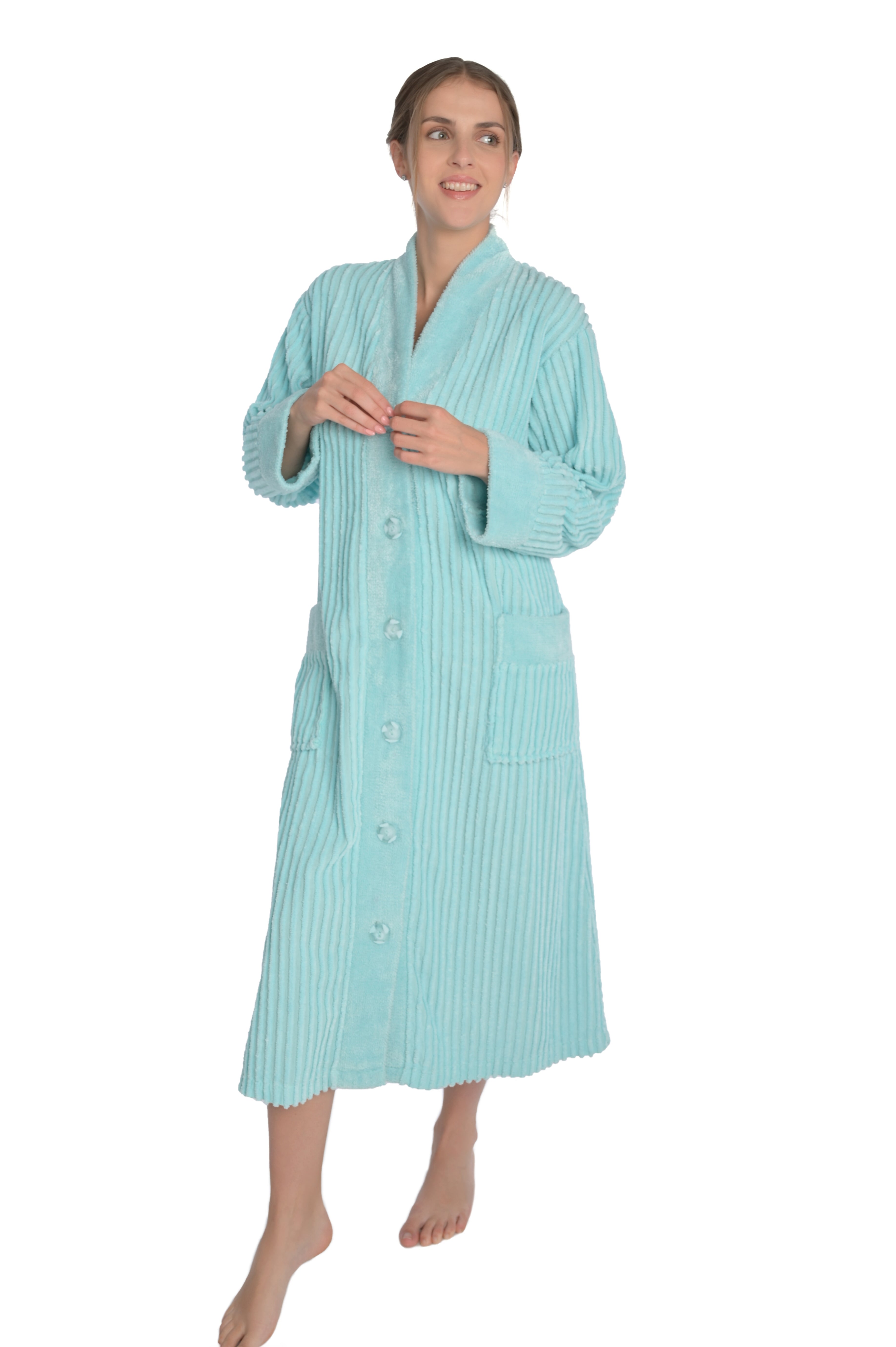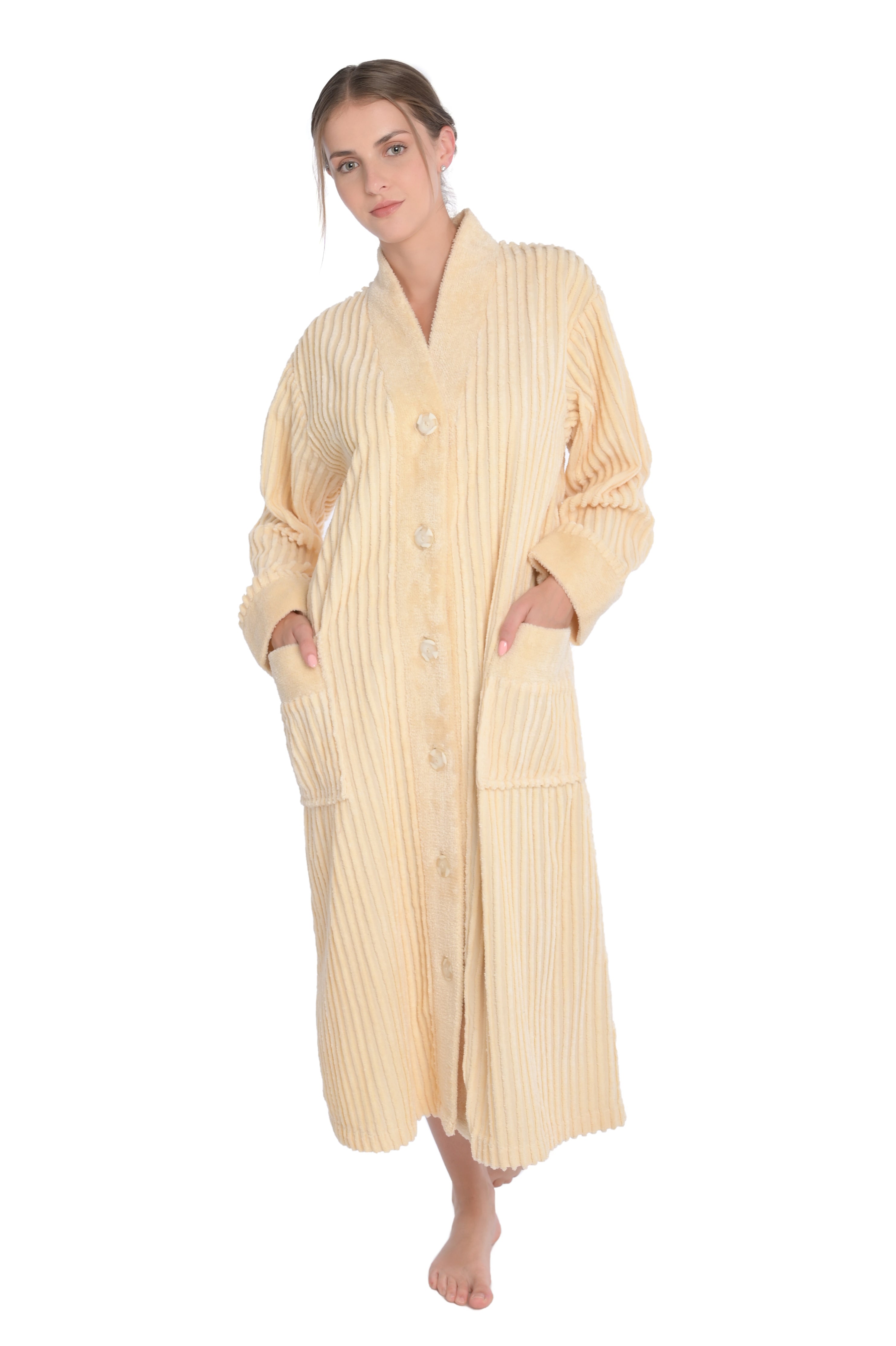 Experience luxury and elegance with our Women's Chenille Button Front Robe Bathrobe. This robe redefines comfort with its buttoned design, showcasing six large buttons at the front that exude both style and functionality. Adorned with two ample patch pockets and enhanced by an all-over striped pattern with contrasting ultimate chenille, this robe encapsulates both fashion and convenience.
